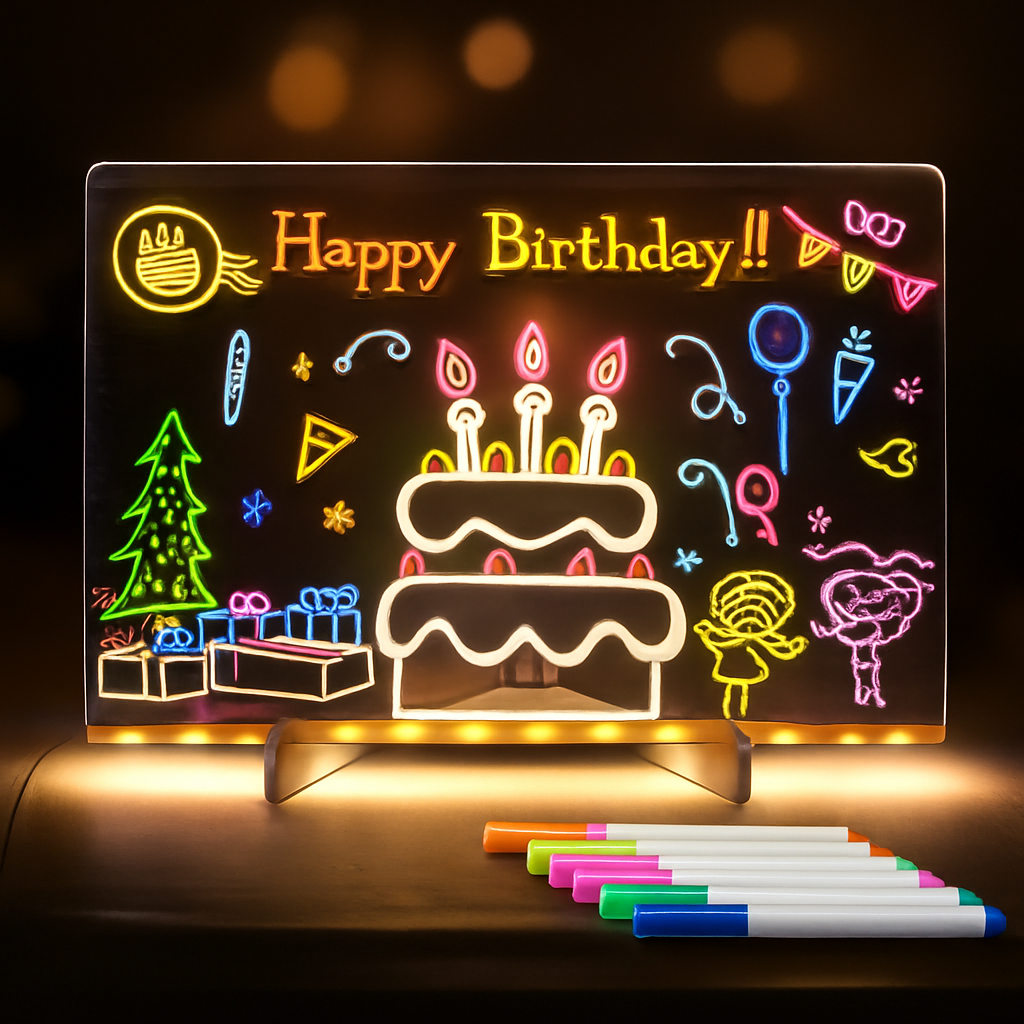 اگر به دنبال یک تختهی نئونی زیبا، کاربردی و متفاوت برای طراحیهای کودکانه یا دکورهای خاص هستید، تخته LED نوشتاری با ماژیکهای رنگی نئونی، انتخابی هوشمندانه است. این تختهی شبتاب، با نور پسزمینهی LED و سطح شفاف، امکان نوشتن پیامهای شخصیسازیشده، نقاشیهای کودکانه یا طراحیهای فانتزی را برای جشن تولد، اتاق کودک یا حتی تبلیغات ویترینی فراهم میکند. با هر بار پاک کردن، تخته آمادهی خلق یک اثر هنری جدید است. اگر به دنبال سرگرمی آموزشی، ابزار طراحی خلاقانه، هدیهای خاص برای بچهها، یا تابلو نوری جذاب برای مناسبتها هستید، این تخته همان چیزیست که نیاز دارید. استفاده آسان، قابلیت نورپردازی در شب، طراحی فانتزی و قابلیت حمل بالا، آن را به یک گزینهی کامل برای کودکان، والدین، کافهداران و حتی طراحان تبدیل کرده است.