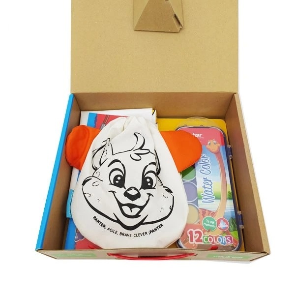 محتویات: آبرنگ ۱۲ رنگ، قلمو، کیسه پلنگی، کارتهای رنگآمیزی، قاب چوبی، نخ، سوزن، سفره بازی و پایه رنگی