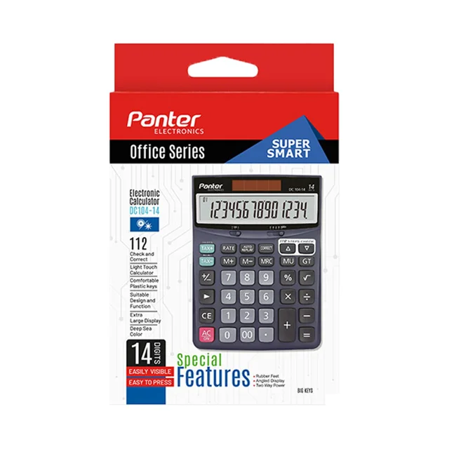 ماشین حساب DC 104-14 پانتر با طراحی جمعوجور و عملکرد دقیق، گزینهای ایدهآل برای انجام محاسبات روزمره است. این دستگاه دارای کلیدهای مقاوم و صفحه نمایش واضح بوده و مناسب استفاده در محل کار، مدرسه و خانه میباشد. دوام بالا و کاربری آسان از ویژگیهای برجسته آن است.
