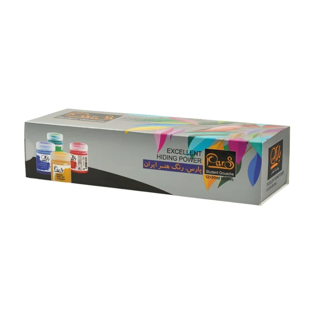 گواش 12 رنگ پارس، مجموعهای کامل و با کیفیت برای نقاشی حرفهای و آماتور، شامل ۱۲ رنگ زنده و پررنگ با پوشش عالی، خشک شدن سریع و قابلیت ترکیب آسان رنگها، مناسب برای مدارس، هنرمندان و علاقهمندان به هنر نقاشی.