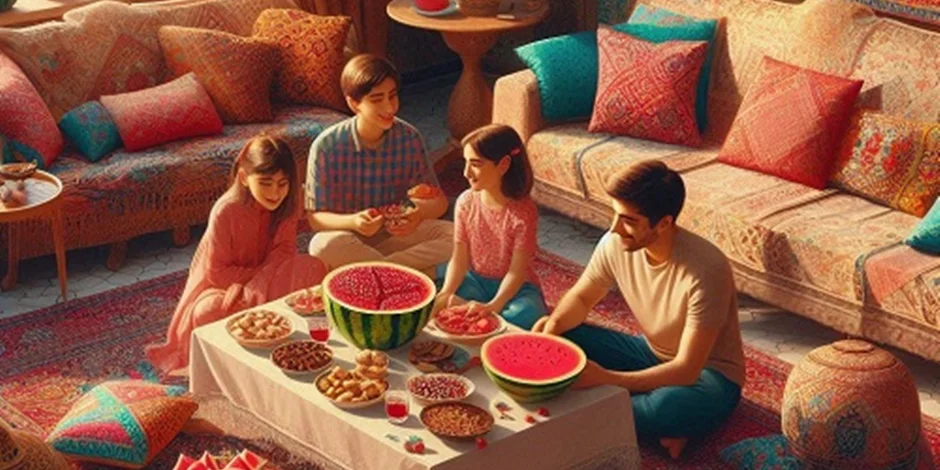 - خوراکیهای خاص : در این شب، خوراکیهای خاصی مانند هندوانه، انار، و آجیل سرو میشود. هندوانه نماد سرما و انار نماد باروری و زندگی است.