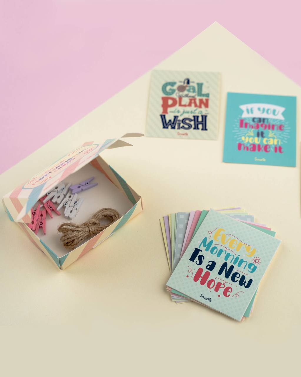 با گیرههای چوبی بامزه و بند کنفی، کارتها رو میتونی روی دیوار اتاق، میز تحریر یا ویژنبرد نصب کنی و هر روز با دیدن یه جمله انگلیسی پرانرژی، هم انگیزه بگیری هم زبانت تقویت بشه.